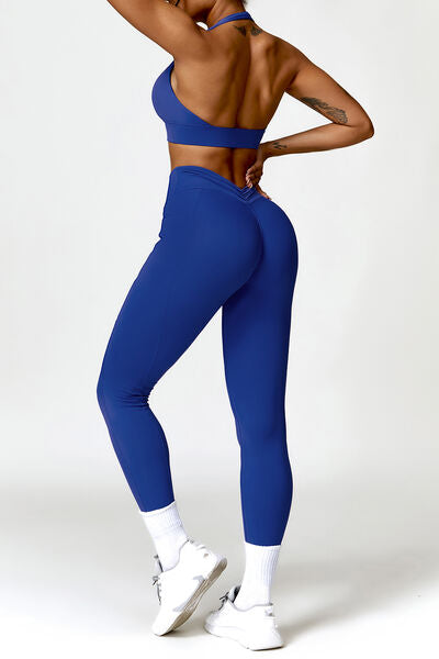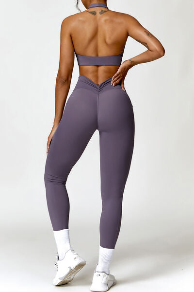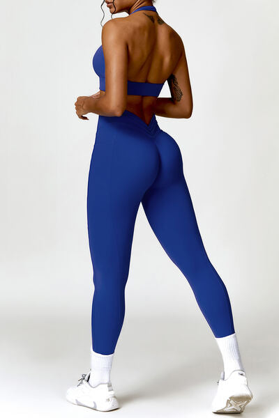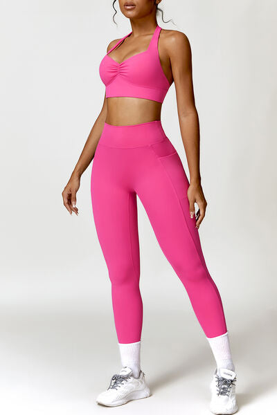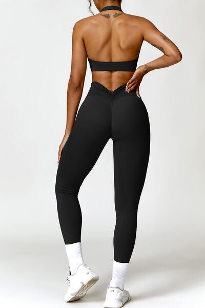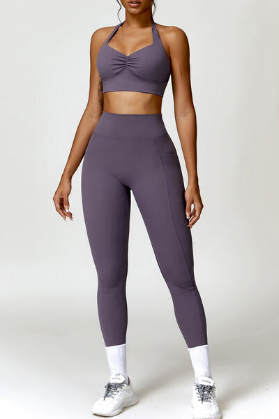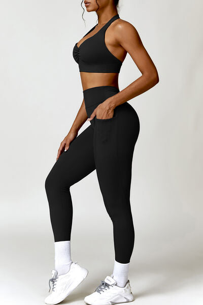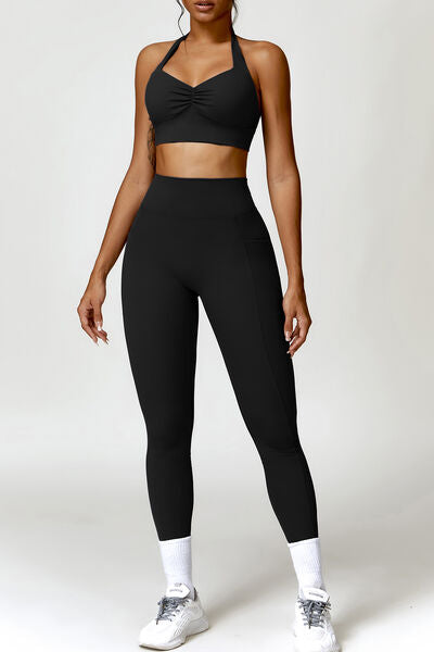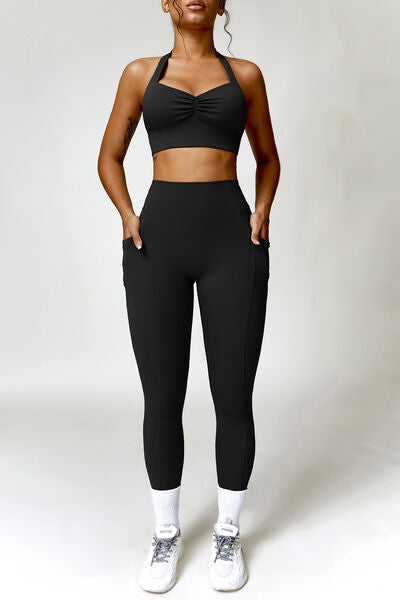 Ruched Halter Neck Bra and Pocketed Leggings Active Set