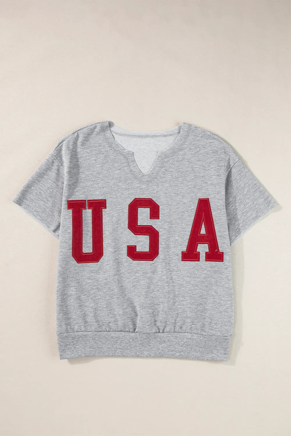 This fashion USA graphic t-shirt combines comfort and patriotic style. Made from a premium cotton blend fabric in a versatile heather gray color, featuring bold red USA lettering across the chest. The notched V-neckline adds a unique design element while maintaining casual appeal. The relaxed fit and soft material make it perfect for everyday wear. Can be easily paired with jeans, shorts or casual bottoms for an effortlessly cool American casual look. Ideal for casual outings, sports events, or showing your USA pride.