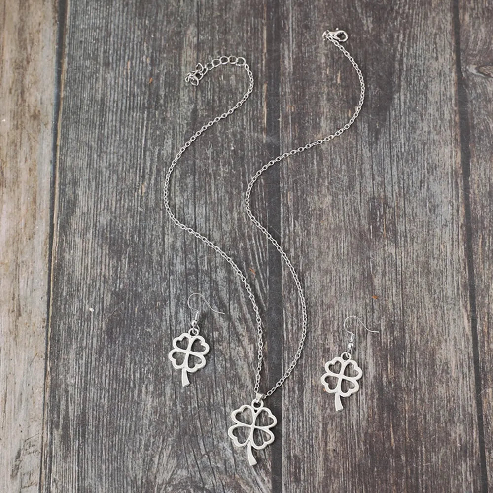 Lucky Clover Alloy Earrings and Necklace Jewelry Set