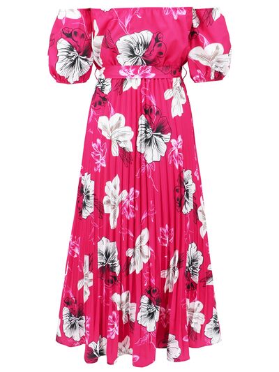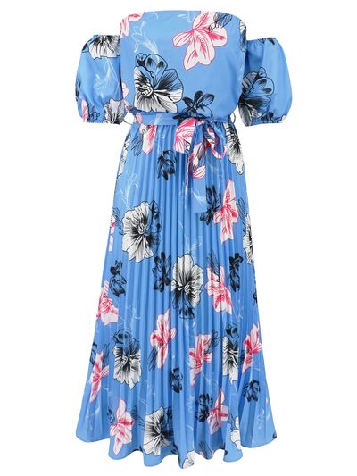Pleated Floral Off-Shoulder Short Sleeve Midi Dress