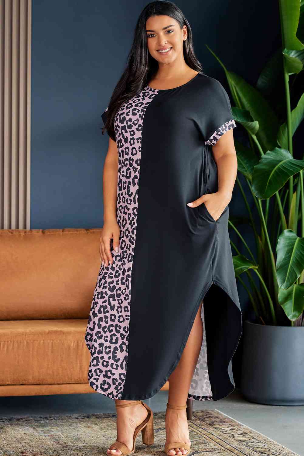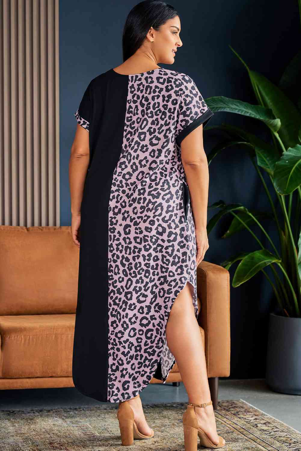 Plus Size Contrast Leopard Short Sleeve Midi Dress