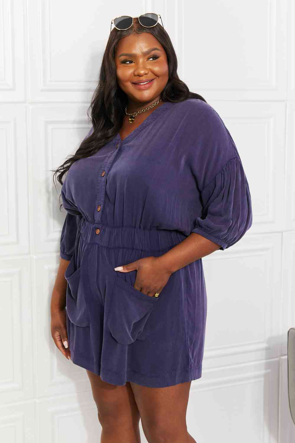 White Birch Full SIze Play It Cool Three-Quarter Sleeve Romper in Blueberry