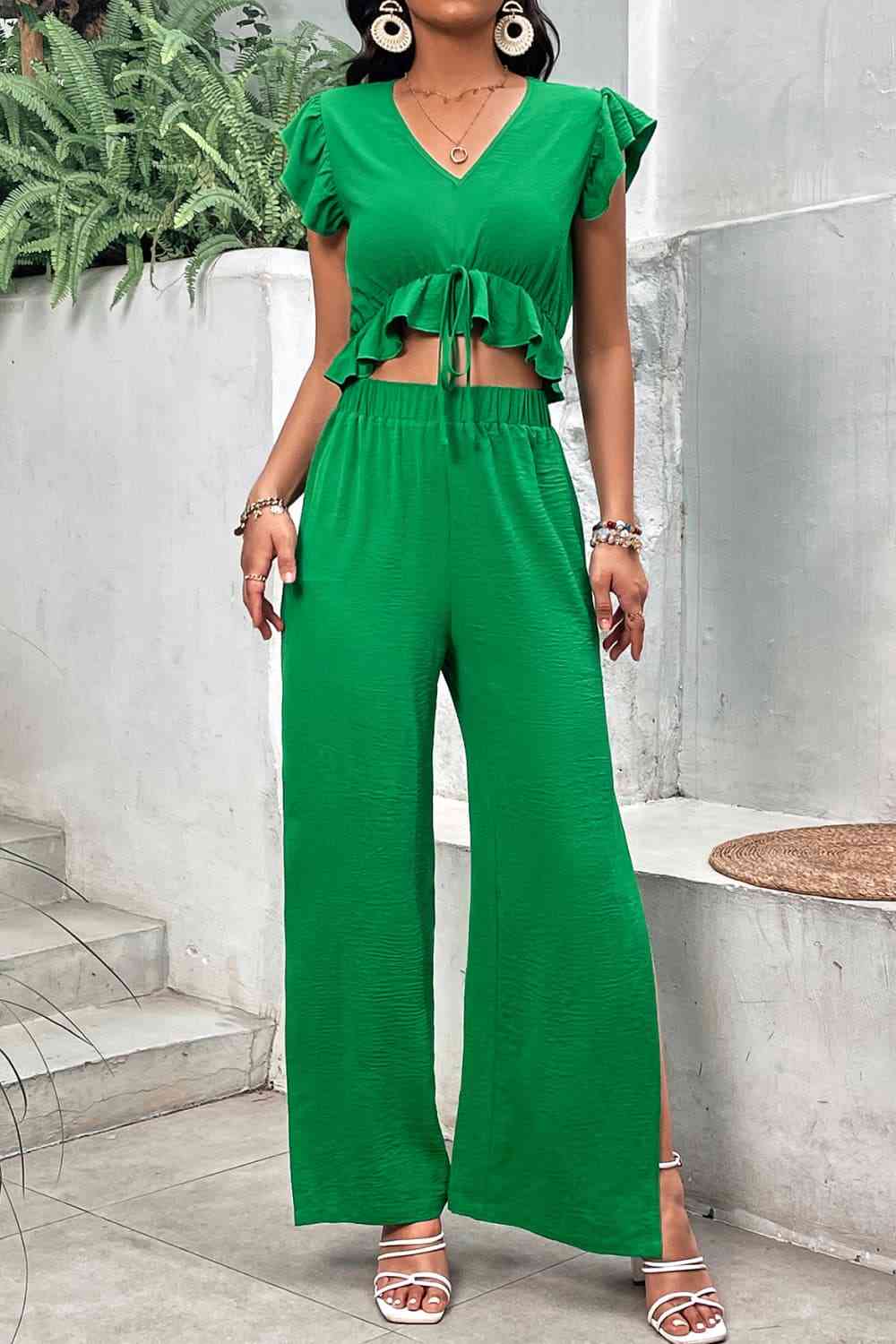 V-Neck Ruffle Hem Top and Slit Pants Set